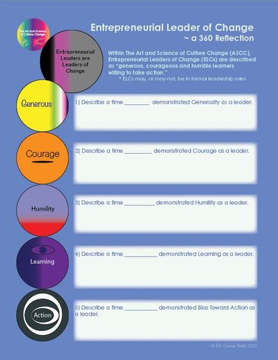 Within The Art and Science of Culture Change, Entrepreneurial Leaders of Change (or 21st/22nd Century Leaders) are described as "generous, courageous, humble learners with a bias toward action."